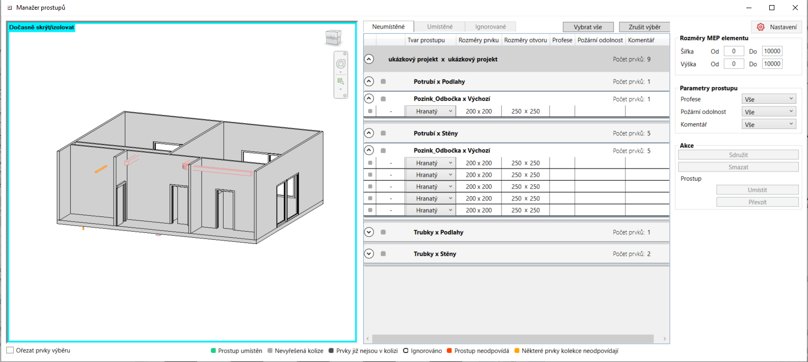 Manažer prostupů je vlastně druhá možnost, jak prostupy vytvářet a editovat. Nabízí náhled na model, kde jednoduše zjistíte, na kterých prvcích budete prostupy vytvářet anebo upravovat. Manažer prostupů Vám sdělí, které kolize byly vyřešeny prostupem a které ne. Dovíte se v něm i to, zda je prostup umístěn dobře anebo došlo k posunu MEP prvku a prostup již neodpovídá. Tento nástroj je dobré využít, chceme-li spravovat jen některé prostupy anebo nechceme vkládat automaticky prostupy na všechny nalezené kolize.