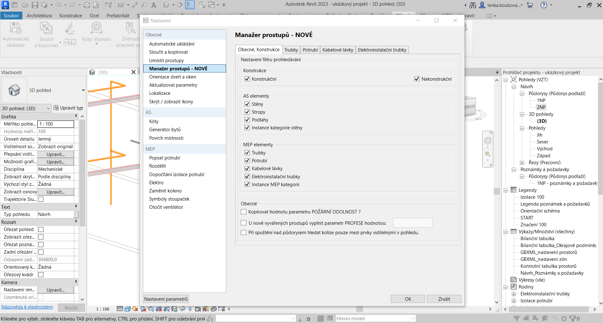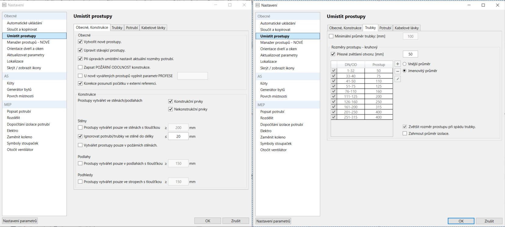 Před samotnou prací s nástrojem je vhodné si nastavit, co vše od nástroje chceme. Můžeme si zvolit, zda bude nástroj vytvářet nové prostupy, upravovat stávající prostupy, od jakých rozměrů prvků má prostupy vkládat atd. V tomto nastavení si můžeme upravit zvětšení prostupu vůči prvku, defaultně je nastaveno 50 mm. Toto zvětšení se řídí kategorií prvku a každá kategorie má svou vlastní kartu s možnostmi nastavení.