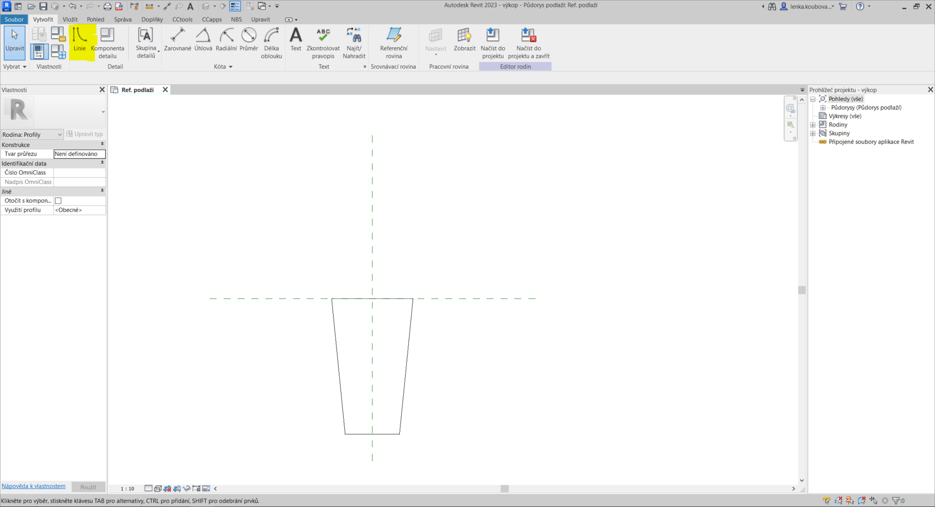 Pro vytváření profilu využijeme „Linie“, kterými nakreslíme samotný profil. Jelikož je v ukázce kreslen výkop, je jeho horní hrana na ose, která představuje následné podlaží. Už v této části je tedy nutné rozmyslet si, jak chceme, aby se nám profil následně vložil v tažení.