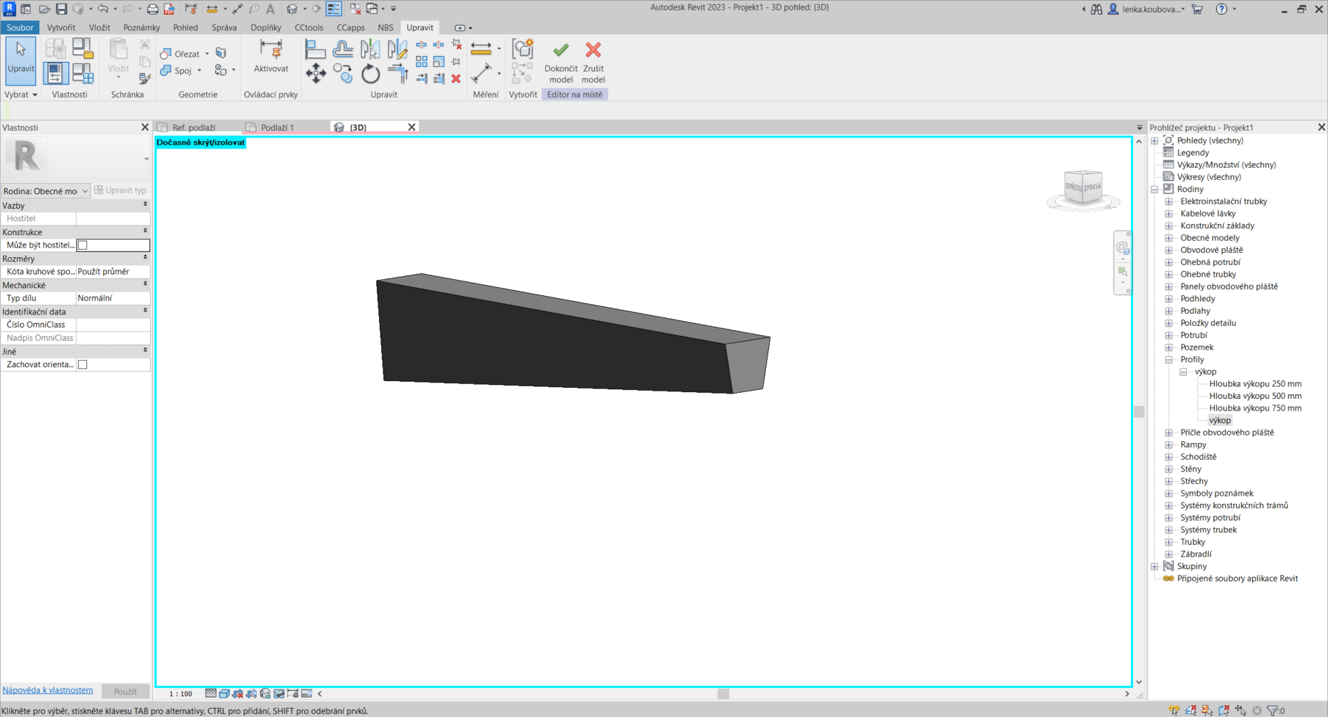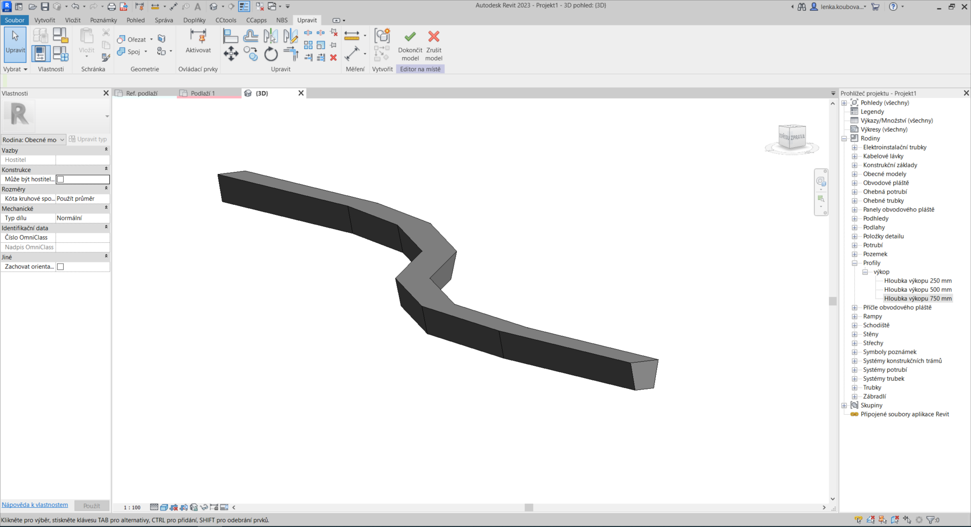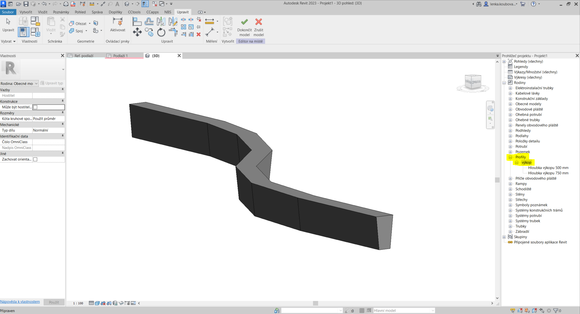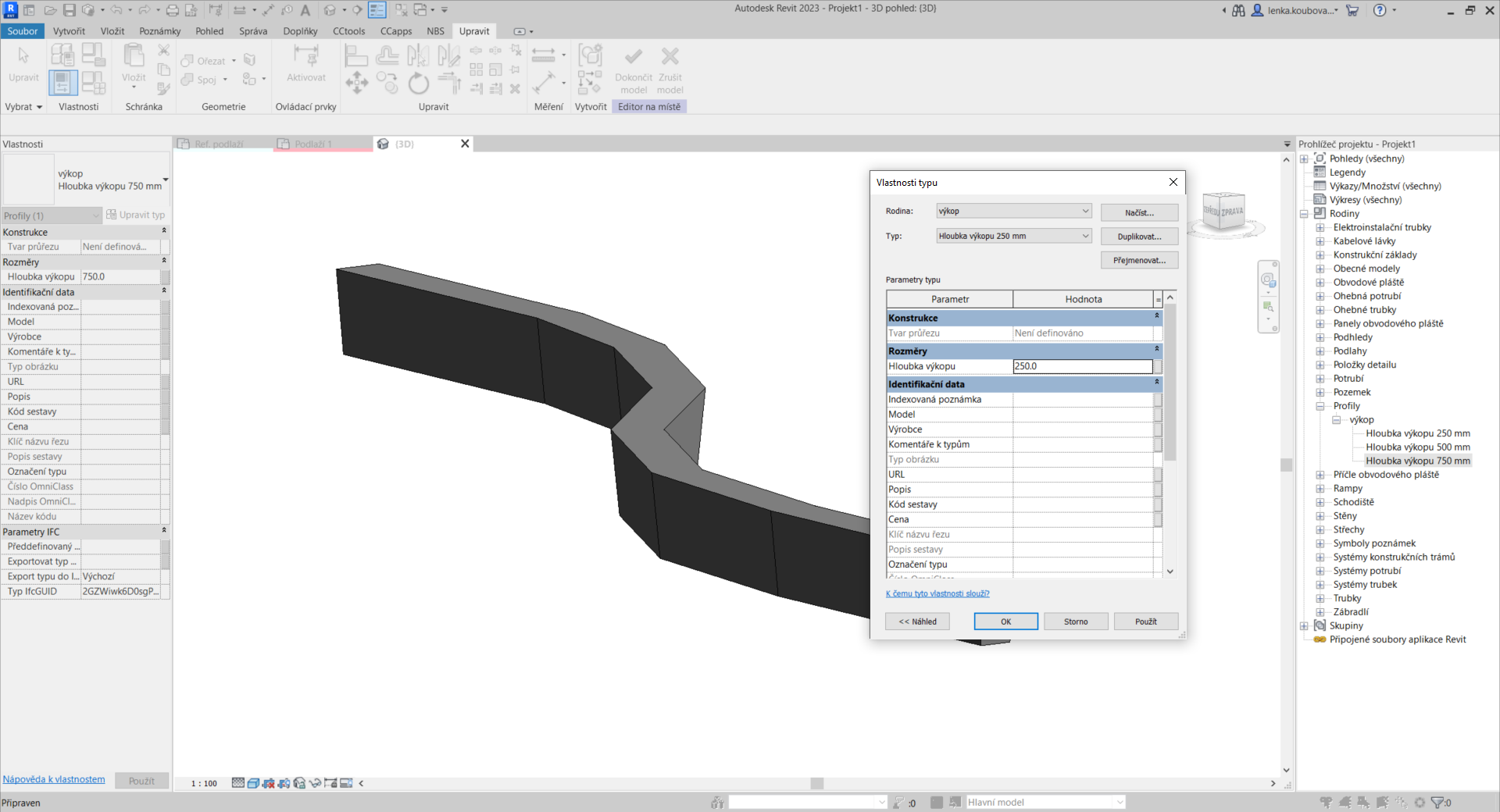 Náš profil můžeme najít v prohlížeči projektu v sekci rodin. Kategorií, pod kterou ho nejdeme, je kategorie „Profily“. Rozbalíme ji. Po kliknutí pravým tlačítkem myši na náš profil máme možnost vybrat „Nový typ“. Ten vybereme a dojde k jeho vytvoření. Tento nový typ si převezme název profilu a hodnotu parametr „Hloubka výkopu“ po jednom z již existujících typů. Je proto potřeba tyto dvě věci změnit na požadované hodnoty.