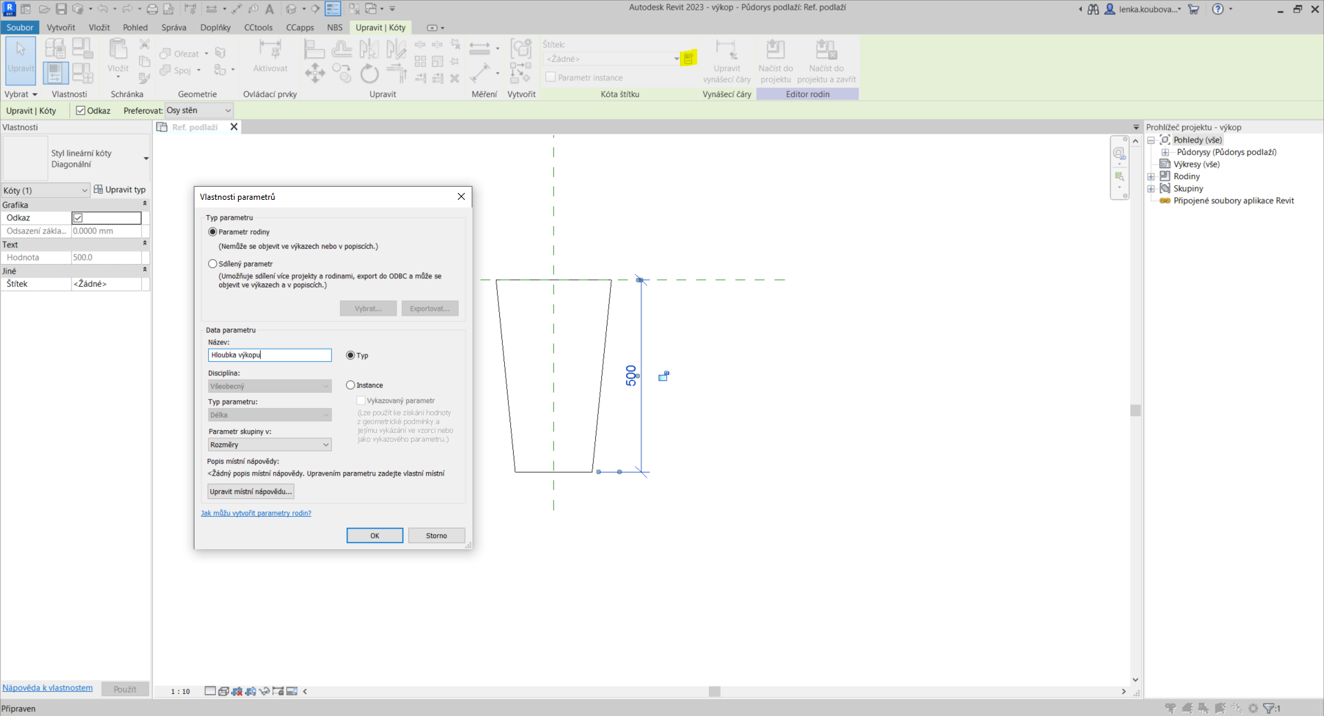 Při označené kótě se objeví možnost přidání štítku, na kterou klikneme. Vyskočí nám tabulka s tvorbou nového parametru. Ten vytvoříme. Pro tento případ byl zvolen parametr s názvem „Hloubka výkopu“. Je typový, protože u profilů nemůžeme pracovat s instancemi. Dále je parametr v kategorii rozměry. Parametr potvrdíme a díky tomuto můžeme měnit hloubku výkopu, jak se nám hodí.