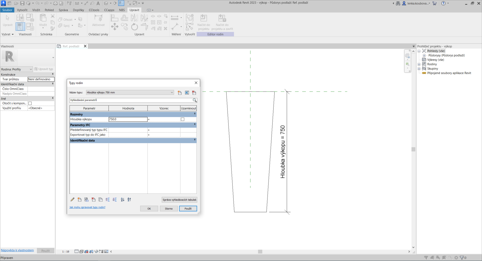 Rovnou při tvorbě profilu si můžeme nadefinovat jeho nové typy podle parametru, který byl právě vytvořen. Tato možnost je k dispozici v „Typy rodin“ na kartě „Upravit“. Pro vytvoření nového typu klikneme na „Nový typ“ a správně ho pojmenujeme. Následně zvolíme i požadovanou hloubku výkopu.
