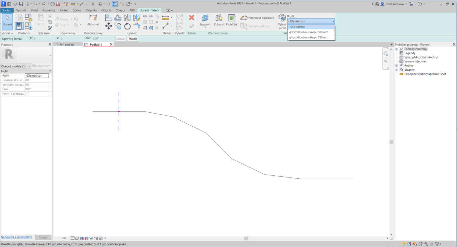 Po vytvoření tažení může přijít požadavek na změnu, v tomto případě, hloubky výkopu na hodnotu, kterou nemáme v profilu nadefinovanou z jeho tvorby. Jednou možností je otevřít si samotný profil a dané hodnoty dodefinovat stejným způsobem, jak již byl popsán výš. Máme ale i druhou možnost dodělání nových typů, a to přímo v projektu.
