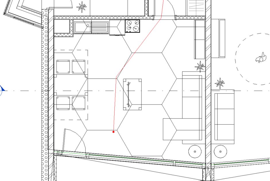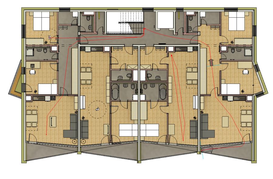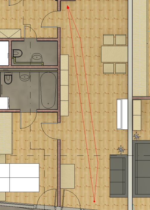 V předchozích případech jsme si ukazovali, jak vytvořit jednu čáru trasy. Můžeme jich vytvořit více najednou, tudíž můžeme Revit nechat hledat tu nejvýhodnější trasu. V mém případě ovšem nebylo možné toto využít, jelikož při vyvolání této funkce se nás Revit ptá, jaký mají mít čáry mezi sebou rozestup, ale tento rozestup může mít minimálně 375 mm. Z tohoto důvodu se mi obě čáry neprošly skrz dveře. S většími dveřmi toto rozhodně použitelné je. Po tom, co Revitu sdělíme odstup tras, opět vybereme dva body stejně jako při používání jedné trasy.