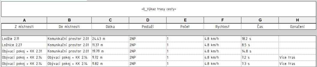 Ze všech našich analýz tras můžeme vyhotovit i výkazy. Výkaz tvoříme klasicky přes „Nový výkaz/množství“ a vybíráme kategorii „Čáry trasy cesty“. Je schovaná až na konci pod kategorií čar. Do tohoto výkazu si můžeme dát parametry jako např.: Délka, Čas, Z místnosti, Do místnosti.