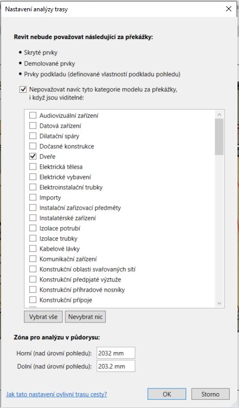 Než se pustíme do samotné analýzy, provedeme její nastavení. K němu se dostaneme kliknutím na malou šipku v pravém dolním rohu obrázku 2. Po kliknutí na ni se nám ukáže okno s nastavením. V první části okna nám Revit říká, že jako překážky nebere skryté prvky, demolované prvky a prvky podkladu. Dále řekneme Revitu, co má považovat za překážky a co ne. Defaultně jsou nastaveny dveře jako jediný prvek, který není překážkou. Prvky, které nemají být překážkou se vybírají podle jejich kategorií. V poslední části okna se nás Revit ptá na zónu pro analýzu. Je to oblast, ve které bude hledat překážky pro trasu.