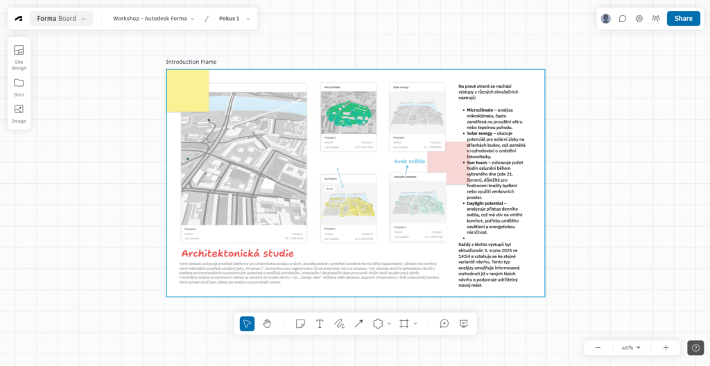 Na screenshotu Autodesk Formy vidíte i Forma Board, o které jsem se zmiňovala v dřívější části článku. V levém horním rohu se nachází nástroje pro vkládání obrázků z Formy, různých souborů z Autodesk Docs nebo také obrázků nahraných přímo z počítače.