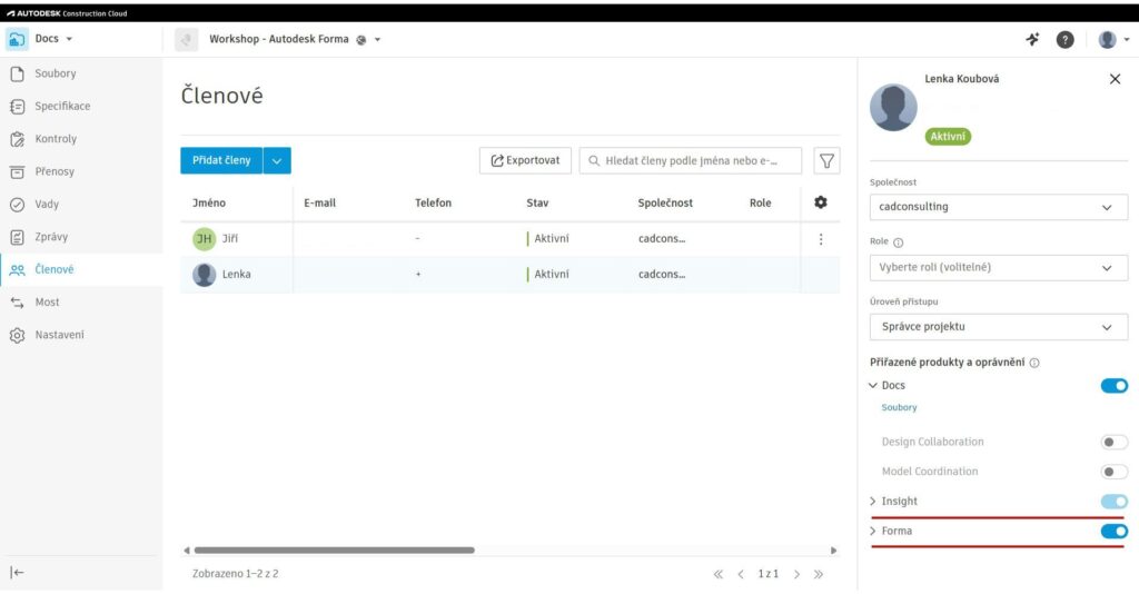 Pro administrátory je správa přístupů k Formě dostupná přímo v prostředí ACC, bez nutnosti přepínání mezi jednotlivými aplikacemi. Mají tak jasný přehled o tom, kteří uživatelé mají k Formě přístup a kteří nikoli. Stejným způsobem se do Formy dostanou i samotní uživatelé, a to přímo z ACC.