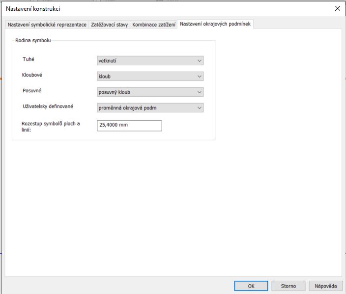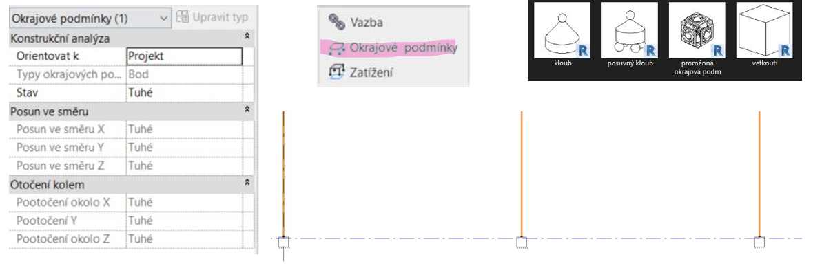 Okrajové podmínky nenastavujeme v rámci našeho projektu, jak bychom mohly očekávat, ale každou okrajovou podmínku reprezentuje jedna rodina. V konstrukční šabloně, kterou má každý k dispozici v Revitu jsou tyto rodiny už předdefinované v kategorii „Okrajové podmínky“. Můžeme využít buď ty nebo si nadefinovat své. Je potřeba ještě v nastavení konstrukcí přiřadit správné okrajové podmínky k rodině symbolu, ale o tom jsme si už pověděli, když jsme se koukali na samotné nastavení konstrukcí.