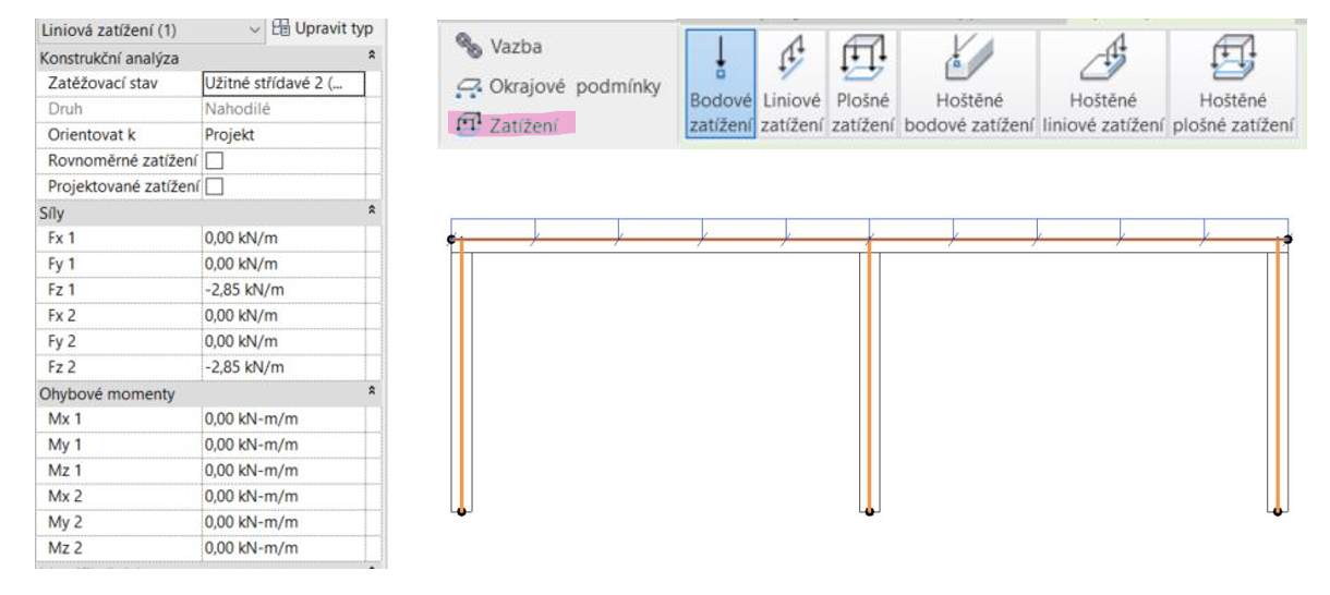 Po vymodelování konstrukčního modelu, nastavení všech jeho prvků a nastavení konstrukcí je na čase se přesunout k zatížení. Zatížení si můžeme vybrat bodové, liniové a nebo plošné. Následně můžeme zvolit hoštěné zatížení. Při přidávání zatížení mu nastavujeme zatěžovací stav. Dále mu přiřadíme hodnotu. Takto můžeme zadat více zatížení k jedné konstrukci.