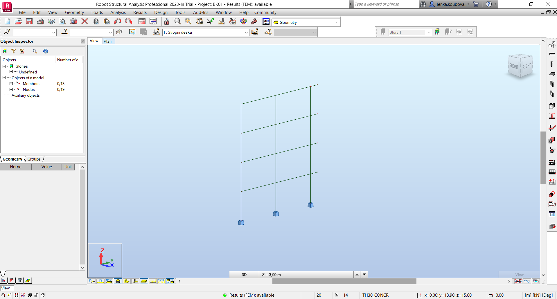 Získávání výsledků této analýzy nebyla věc, která by mi udělala při prvním zkoumání radost. Bezplatná aplikace Autodesku již pro verze Revitu, které se používají v současné době, k dispozici a tak je nutné si pořídit software „Autodesk Robot Structural Professionals“ a nebo využít Sciu či Dlubal. Já jsem pro výpočet využila Robot.