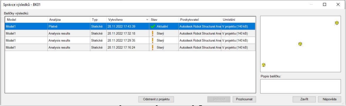 Po provedení výpočtu se už konečně dostáváme k samotným výsledkům. Ve správci výsledků si můžeme ověřit, zda máme v našem souboru aktuální výsledky. Dovíme se zde i kdy byly vytvořené a v čem.