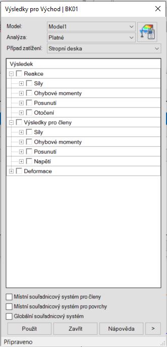 V průzkumníku výsledků si můžeme zobrazovat jaké výsledky zrovna chceme. Výsledky se zobrazují nad aktuálně otevřeným pohledem. Zvolíme pro jaké zatížení chceme výsledky vidět. Následně volíme, které síly, momenty, napětí apod. se nám mají zobrazit. Revit nám dovoluje vybrat si souřadnicový systém.