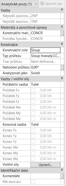 Pruty nám mohou nahrazovat sloupy, nosníky atd. Je tu možnost každému prutu přiřadit jeho materiál, tudíž takto nadefinujeme všechny hodnoty, které potřebujeme znát ke statickým výpočtům. Jak všichni určitě víme, materiál nese informaci i o veličinách jakou je pevnost, objemová hmotnost atd. Každému prutu určujeme konstrukční roli. Toto je něco, co je předdefinováno v Revitu. Máme na výběr mezi: nosník, sloup, prvek, průvlak, žádné. Dále každému prutu můžeme přiřadit typ průřezu, natočení průřezu a způsob analýzy. Poslední věc, kterou můžeme takto přiřadit každému prutu, jsou síly na začátku a na konci prutu.