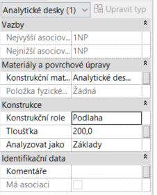 Deskám opět můžeme přiřadit konstrukční materiál. O tom jsme si už více řekli u prutů. Dále volíme jejich konstrukční roli. Máme na výběr z: podlaha, stěna, deska. U desek nezadáváme typ průřezu, ale jen jejich tloušťku. Poslední možností je volba, jak má Revit danou desku analyzovat.