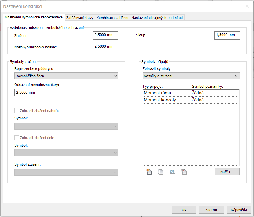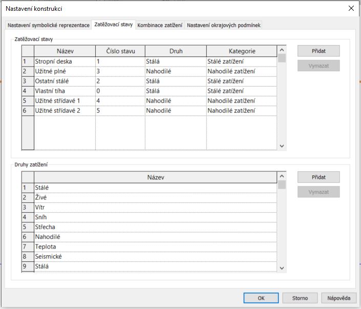 V tomto okně si nadefinujeme zatěžovací stavy a druhy zatížení. Druhy zatížení můžeme využít defaultní nebo přidat své. Zatěžovacím stavům můžeme měnit název, určit jim číslo, které ale nemá na výsledek vliv, jejich druh a následně kategorii. Samozřejmě lze mazat a přidávat své zatěžovací stavy.