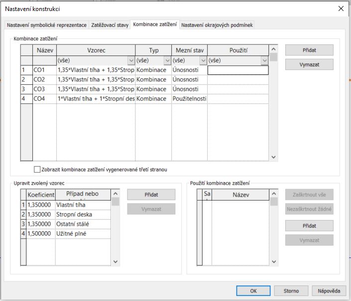Další záložkou je kombinace zatížení. Kombinace můžeme opět přidávat a nebo mazat. Lze jim dát svůj název. Vzorec přidáme tak, že klikneme kamkoliv do kombinace zatížení a klikneme na „Přidat“ pod „Upravit zvolený vzorec“. Takto si přidáme tolik zatížení, kolik jich potřebujeme a následně přepíšeme koeficient na náš požadovaný a vybereme potřebné zatížení. Námi provedenou změnu vidíme hned u „Kombinace zatížení“ a „Vzorec“. Následně vybereme ještě „Typ“, „Mezní stav“ a „Použití“. Použití nadefinujeme stejným způsobem jako vzorec.