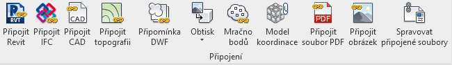 Na kartě Vložit – Připojení jsou umístěné funkce připojení souborů různých typu. Po stisknutí se otevře okno, ve kterém vybereme soubor, který chceme načíst a zadáme potřebné nastavení pro umístění. (Více o počátcích projektu v Revitu se dozvíte zde)