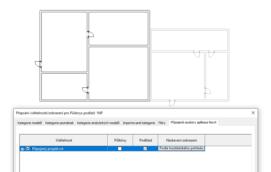 V případě připojení Revit souborů zobrazení se spravuje na kartě Připojené soubory aplikace Revit. Zaškrtnutí možnosti Půltóny nebo Podklad změní zobrazení připojeného souboru. Standardně v obojích případech soubor bude vypadat šedě.