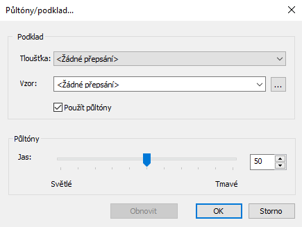 Rozdíl mezi varianty se projevuje v nastaveních: Správa – Nastavení – Doplňková nastavení – Půltóny/Podklad.