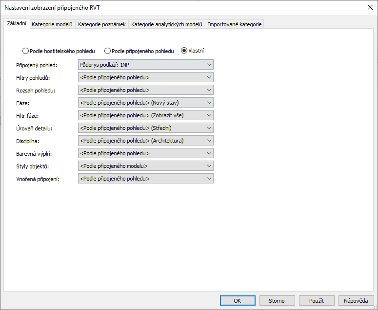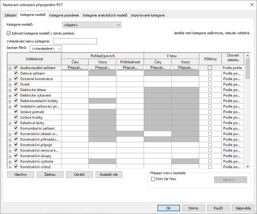 Stejným způsobem při nastavení Vlastní na dalších kartách se dá upravovat zobrazení a přepsání grafiky u RVT modelu.