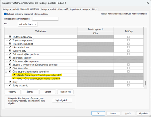 Nově lze také skrývat nebo zobrazovat čísla stupňů a podstupnic nad a pod rovinou řezu. Tuto možnost najdete ve Viditelnosti/zobrazení.