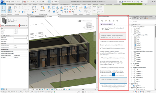 Asistent pracuje přímo v rozhraní Revitu, má přehled o celém projektu a dokáže vám okamžitě usnadnit práci pomocí jednoduchých příkazů. Pomůže vám například: