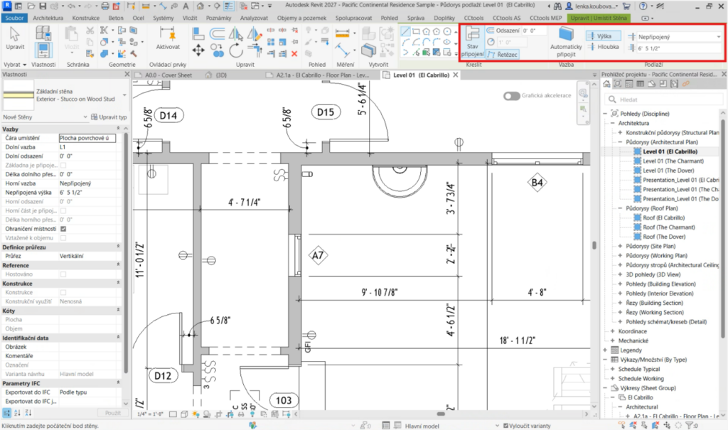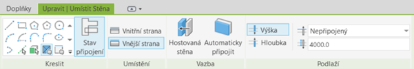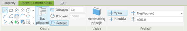 Při otevření režimu tvorby stěny je patrné přidání položky Stav připojení a možnosti Řetězec. Možnosti Umístit podle místnosti a Umístit podle segmentu byly přesunuty do nabídky Kreslit. Lišta, která se dříve zobrazovala vodorovně pod těmito možnostmi, je nyní součástí panelu Upravit | Umístit stěnu.