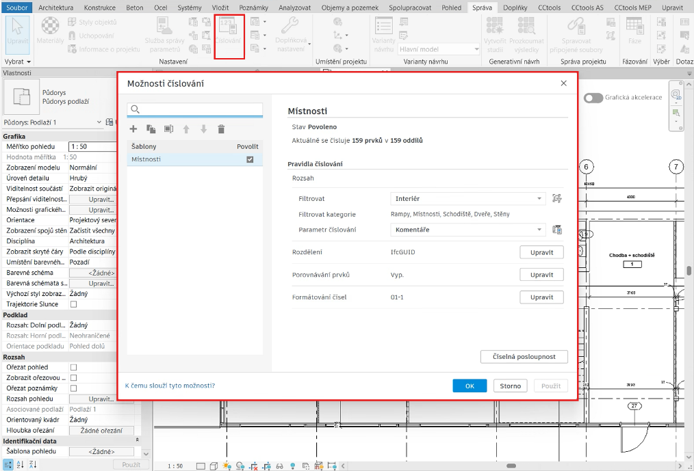 - Číslování lze dělit podle podlaží či místností a definovat vlastní formáty (předpony, počet číslic).