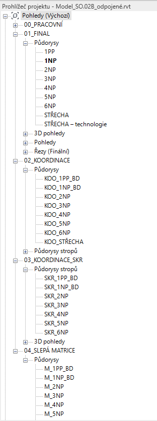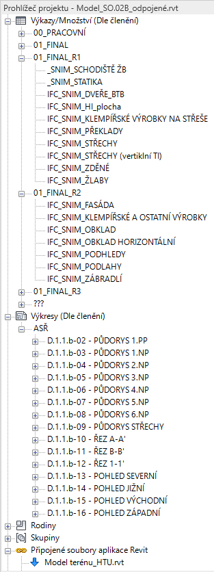 Na obrázku níže si můžete prohlédnout nastavení, které využívá uživatelského parametru Členění a systémového parametru Rodina a typ a každá kombinace Rodiny a typu různých Pohledů má svoji sekci nebo lze využít Seskupování Rodina a typ a v tomto případě tedy v rámci sekce Řezy vzniknou podsekce podle typu (např. Pracovní a Finální).