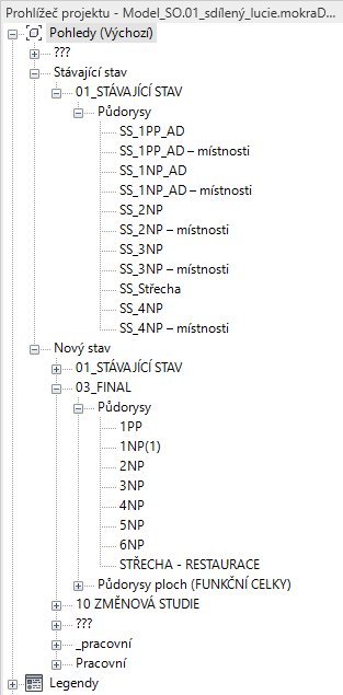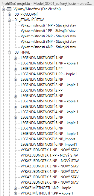 Obdobně lze vytvořit typy pro půdorysy, například klasické půdorysy vs. barevná schémata podlaží, nebo typy pro výkazy prvku vs. tabulky místností.