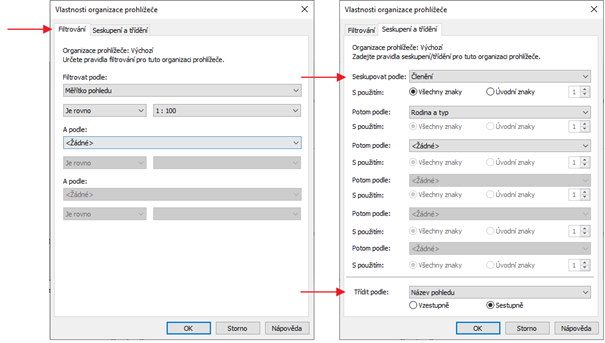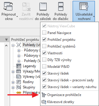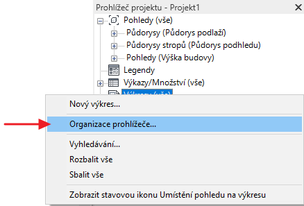 K nastavení uspořádání se lze prokliknout opět přes nastavení uživatelského rozhraní na kartě Pohled nebo po kliknutí pravým tlačítkem na Pohledy, Výkazy (Tabulky) nebo Výkresy v rámci prohlížeče projektu a zvolením Organizace prohlížeče.