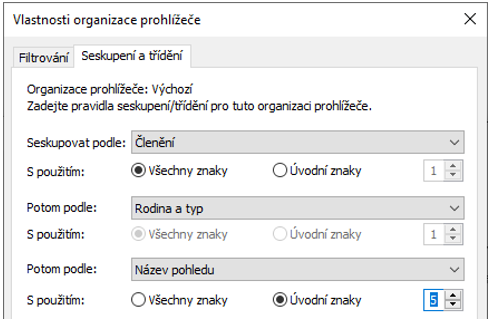 Samotné seskupování funguje na principu, na jaký jsme zvyklí z práce s výkazy, ale má i něco navíc! Pro nastavení organizace není nutné využívat celé hodnoty vybraných parametrů. Pokud do názvu pohledu uvádíte předponu, podle které chcete seskupovat, stačí přepnout na úvodní znaky a zadat jejich počet.