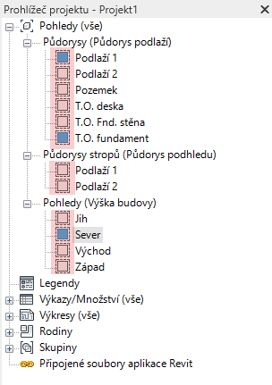 Pohledy Půdorys, 3D Pohled, Řez, Výkaz nebo Výkres … jsou systémové rodiny, které mohou mít libovolný počet typů.