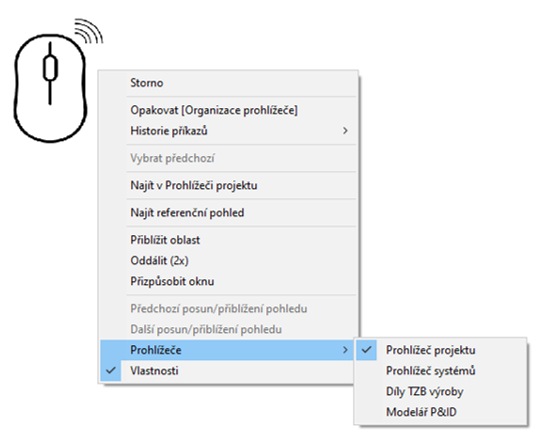 - Kliknutím pravým tlačítkem libovolně do modelového prostoru a vybráním „Prohlížeč projektu“ jako na obrázku níže nebo