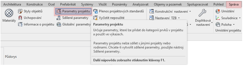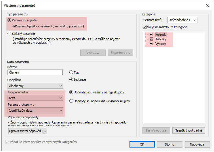 Projektový parametr jednoduše vytvoříte na kartě Správa. Důležité je, aby byl parametr Projektový, instanční a byl přiřazen kategoriím Pohledy a/nebo Tabulky a/nebo Výkresy. Pro snadnou orientaci je vhodné umístit jej do skupiny Identifikační data.